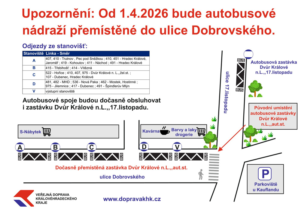 Jednotlivá stanoviště (A, B, C, D, V) nově najdete dle aktuálního rozpisu. Vybrané spoje budou navíc obsluhovat i zastávku Dvůr Králové n. L., 17 listopadu. Pro snadnou orientaci doporučujeme sledovat přehledný plánek a značení přímo na místě.